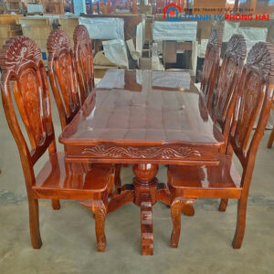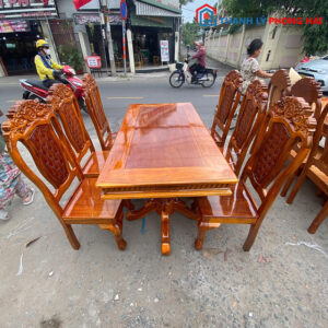 Mô tả: Bộ bàn ghế ăn gồm một bàn chữ nhật và 6 ghế tựa, với thiết kế cổ điển mang đậm phong cách hoàng gia. Mặt bàn và ghế được làm từ gỗ tự nhiên sơn bóng, mang lại vẻ sang trọng và độ bền cao. Phần lưng ghế được chạm khắc họa tiết tinh xảo, tạo điểm nhấn độc đáo cho không gian phòng ăn. Chân bàn chắc chắn với thiết kế uốn cong mềm mại, đảm bảo sự ổn định và an toàn khi sử dụng. Bộ bàn ghế phù hợp cho không gian phòng ăn rộng rãi, mang lại cảm giác ấm cúng và lịch lãm cho gia đình.