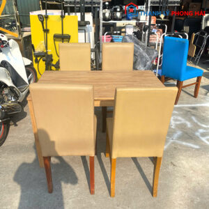 Bàn quán ăn 4 ghế có thiết kế hình chữ nhật như hình dưới, kết hợp 4 ghế có lưng dựa. Tất cả được làm từ gỗ cao cấp nên có khả năng chống mối mọt, cong vênh, ẩm mốc kết hợp với chân sắt sơn tĩnh điện cứng cáp, chắc chắn. Bộ bàn ăn có thể gấp gọn nên sử dụng vô cùng tiện lợi. Chất liệu: Bộ bàn ghế gỗ Kích thước: Bàn 1m + 4 ghế