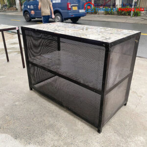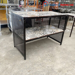 Bàn bếp thiết kế chắc chắn với khung sắt sơn tĩnh điện, kết hợp mặt đá hoa văn bền đẹp, chống thấm nước và dễ dàng vệ sinh. Bàn có kệ bên dưới tiện lợi để sắp xếp vật dụng nhà bếp gọn gàng. Phù hợp sử dụng cho quán ăn, gia đình hoặc làm bàn chế biến thực phẩm.