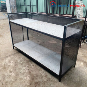 Bàn bếp thiết kế chắc chắn với khung sắt sơn tĩnh điện, kết hợp mặt đá hoa văn bền đẹp, chống thấm nước và dễ dàng vệ sinh. Bàn có kệ bên dưới tiện lợi để sắp xếp vật dụng nhà bếp gọn gàng. Phù hợp sử dụng cho quán ăn, gia đình hoặc làm bàn chế biến thực phẩm.