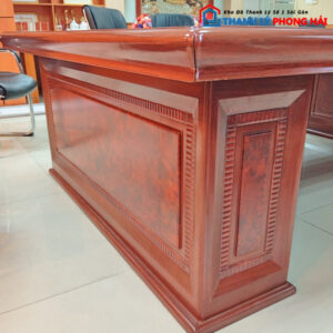 Bàn được làm từ gỗ công nghiệp MDF chuyên dụng, kết hợp với các chi tiết bề mặt bằng veneer và da cao cấp, giúp chống trầy xước, thấm nước và duy trì độ bền lâu dài. Thiết kế này không chỉ mang lại độ bền bỉ mà còn tạo điểm nhấn sang trọng và tinh tế cho sản phẩm. Đặc biệt, phần chân và viền bàn được làm tỉ mỉ, với các họa tiết tinh xảo, mang đến một tổng thể hoàn hảo cho không gian phòng họp cao cấp.
