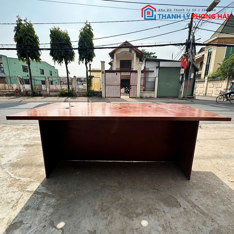 Mẫu bàn họp gỗ cũ có kiểu dáng đơn giản, mặt bàn phẳng rộng, phù hợp sử dụng cho phòng họp công ty, văn phòng làm việc, phòng đào tạo hoặc khu vực họp nhóm. Thiết kế gọn gàng, không cầu kỳ, giúp không gian nhìn thoáng và dễ bố trí ghế xung quanh.