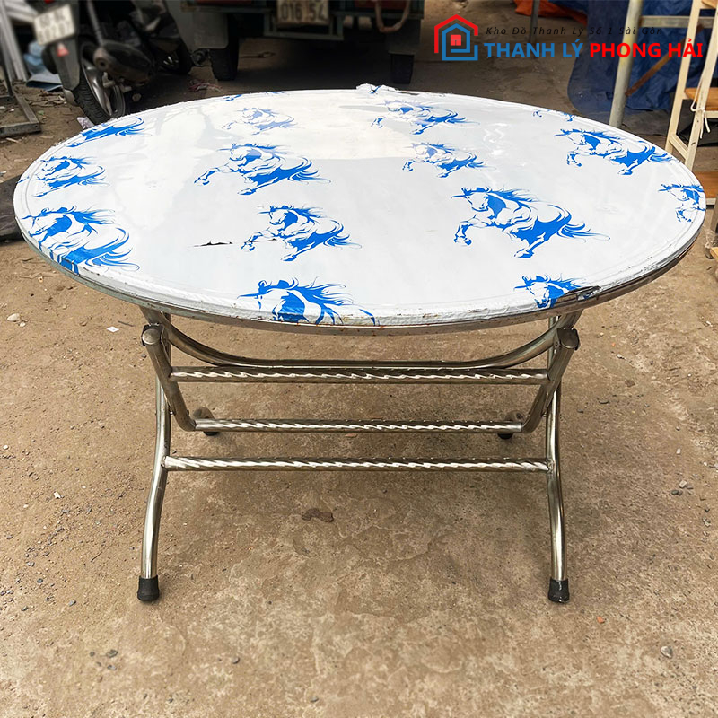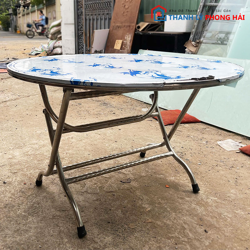 Mẫu bàn inox gấp gọn cũ có thiết kế mặt tròn, khung chân xếp gọn tiện dụng, phù hợp sử dụng cho quán ăn bình dân, quán nhậu, tiệc ngoài trời hoặc hộ gia đình. Bàn có kết cấu chắc chắn, mặt phẳng rộng vừa đủ cho 3–4 người ngồi, đáp ứng tốt nhu cầu ăn uống hằng ngày. Toàn bộ bàn làm từ inox sáng bóng, chống gỉ sét, dễ lau chùi sau khi sử dụng, đặc biệt phù hợp môi trường ẩm hoặc thường xuyên vệ sinh.
