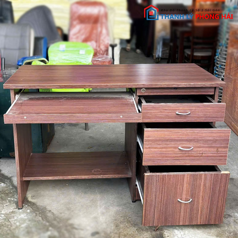Bàn kèm ngăn kéo bàn phím tiện lợi. Màu nâu vân gỗ sang trọng, phù hợp cho văn phòng, phòng học hoặc làm việc tại nhà. Chất liệu gỗ công nghiệp phủ Melamine chống trầy, dễ vệ sinh. Khung bàn vững chắc, chịu lực tốt, các ngăn kéo trượt mượt, không kẹt. Bàn còn mới, kiểu dáng gọn gàng giúp tối ưu không gian làm việc. Hàng thanh lý sử dụng ngay giúp tiết kiệm chi phí mà vẫn đảm bảo tính thẩm mỹ và tiện dụng.