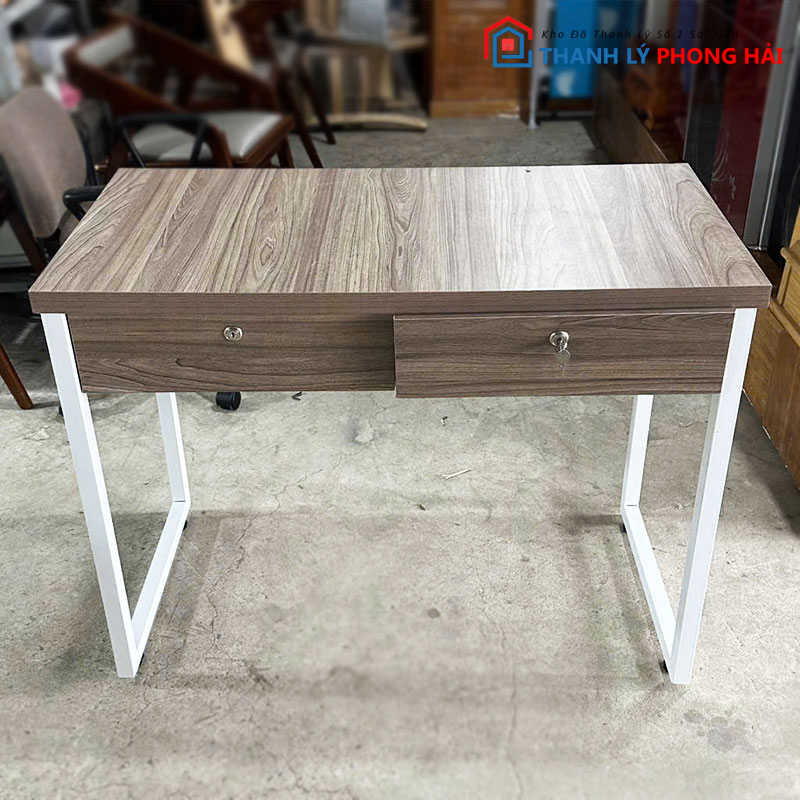 Bàn làm việc 1m thiết kế khung chân sắt vuông chắc chắn, sơn tĩnh điện màu trắng, kết hợp mặt bàn gỗ công nghiệp phủ melamine vân nâu sang trọng. Bàn có 2 hộc kéo nhỏ phía dưới mặt bàn giúp lưu trữ giấy tờ, vật dụng cá nhân gọn gàng, phù hợp cho nhân viên văn phòng, học sinh hoặc dùng làm bàn học tại nhà. Dáng bàn hiện đại, dễ phối với nhiều kiểu ghế, thuận tiện di chuyển và bền đẹp theo thời gian.