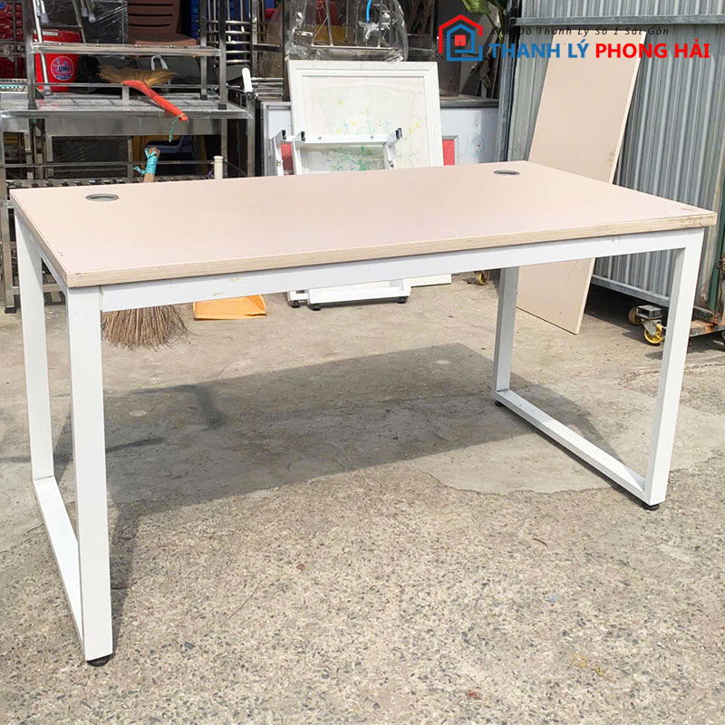 Mặt bàn gỗ công nghiệp phẳng, kích thước vừa đủ để đặt máy tính, tài liệu và các vật dụng cần thiết. Trên mặt bàn có lỗ đi dây tiện lợi, giúp luồn dây điện, dây mạng gọn gàng, hạn chế rối mắt khi sử dụng. Phần chân sắt chữ U sơn chắc chắn, đứng vững, chịu lực tốt, phù hợp dùng lâu dài. Bàn đã qua sử dụng nhưng kết cấu còn ổn định, dùng tốt cho nhu cầu làm việc hằng ngày.