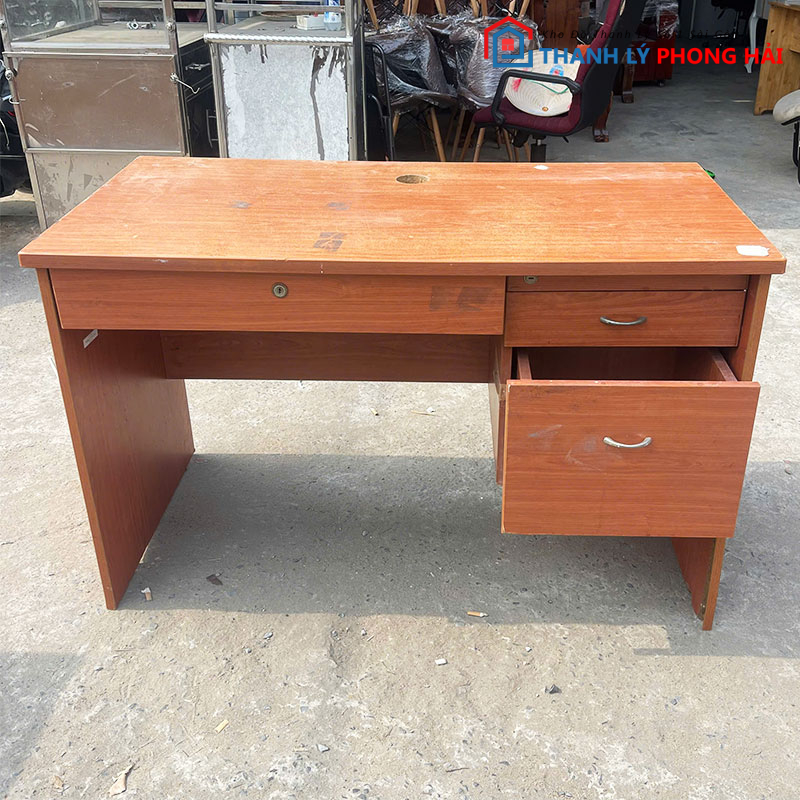 Bàn được tích hợp hệ tủ hồ sơ treo bên hông, gồm ngăn kéo và hộc chứa đồ, thuận tiện lưu trữ hồ sơ, giấy tờ hoặc vật dụng cá nhân. Chất liệu gỗ công nghiệp phủ vân gỗ, bề mặt dễ lau chùi, kết cấu chắc chắn, sử dụng ổn định trong quá trình làm việc hằng ngày. Hàng đã qua sử dụng nhưng còn dùng tốt, lấy về là dùng ngay.