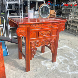 Mô tả: Bàn thờ cũ làm từ gỗ tràm có kiểu dáng trang nghiêm, phần mặt trên đủ chỗ bày lễ vật, ảnh thờ hoặc bát nhang. Họa tiết chạm khắc đơn giản nhưng tinh tế, toát lên vẻ ấm cúng. Sơn màu trầm, lau chùi nhanh, ít phai màu. Kết cấu khung chắc, không rung lắc, phù hợp căn hộ vừa hoặc nhà riêng muốn góc thờ gọn gàng mà vẫn đủ trang trọng.