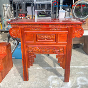 Mô tả: Bàn thờ cũ làm từ gỗ tràm có kiểu dáng trang nghiêm, phần mặt trên đủ chỗ bày lễ vật, ảnh thờ hoặc bát nhang. Họa tiết chạm khắc đơn giản nhưng tinh tế, toát lên vẻ ấm cúng. Sơn màu trầm, lau chùi nhanh, ít phai màu. Kết cấu khung chắc, không rung lắc, phù hợp căn hộ vừa hoặc nhà riêng muốn góc thờ gọn gàng mà vẫn đủ trang trọng.