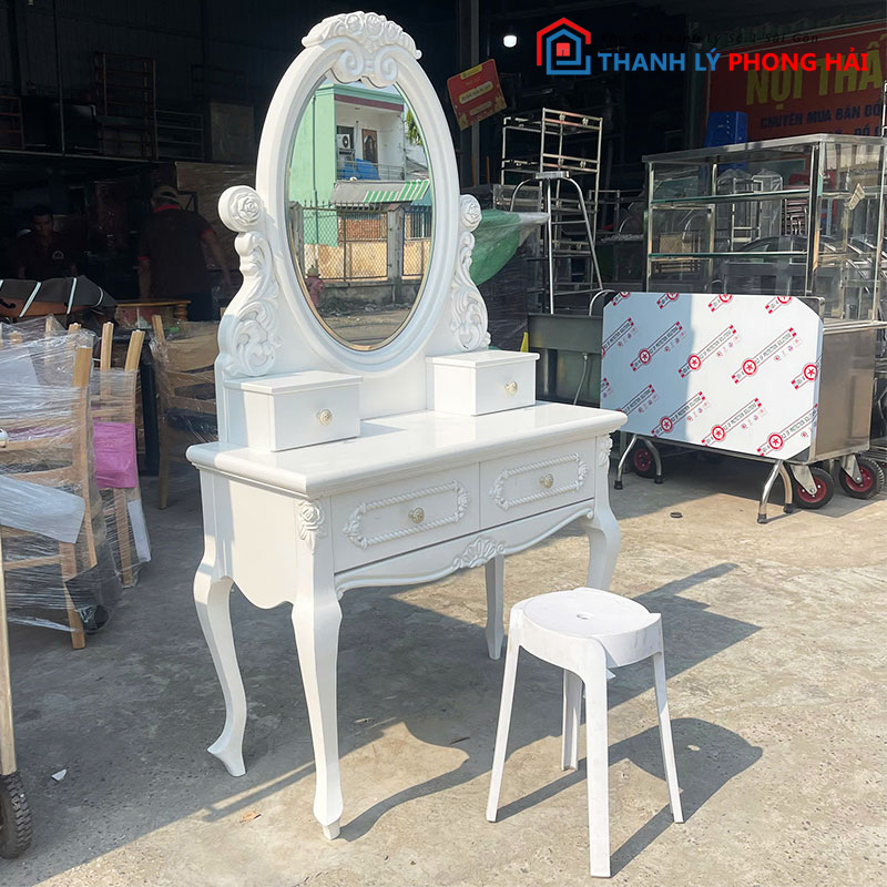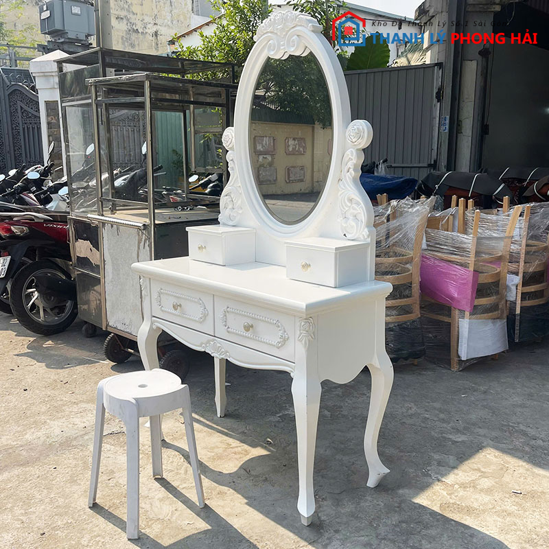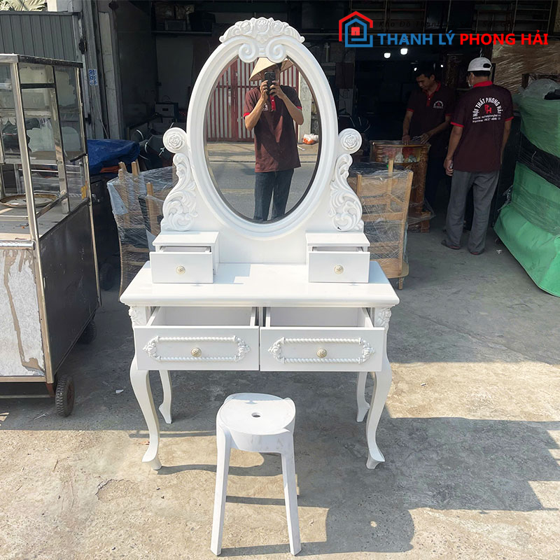 Mẫu bàn trang điểm hoàng gia này phù hợp cho anh chị muốn decor phòng ngủ đẹp mắt với chi phí tiết kiệm. Anh chị có thể ghé kho Phong Hải xem trực tiếp hoặc liên hệ Zalo để được gửi hình thực tế và giữ hàng nhanh. Xem thêm nhiều mẫu hơn tại danh mục “bàn trang điểm cũ“!