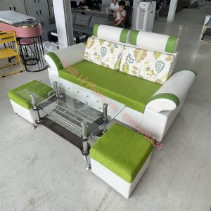 Chất liệu: Bộ sofa được bọc vải kết hợp simili, bàn chân inox mặt kính.