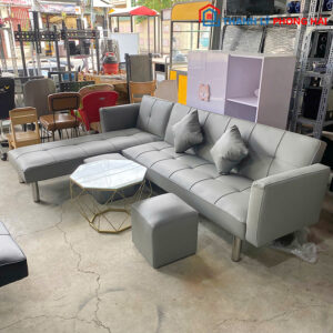 Mô tả: Băng sofa góc L cũ thiết kế hiện đại với màu si xám trung tính, dễ dàng phối hợp với nhiều phong cách nội thất. Bề mặt bọc da mềm mịn, chống bám bụi, dễ lau chùi. Đệm ngồi dày dặn, tựa lưng có độ nghiêng vừa phải giúp tạo cảm giác thoải mái khi sử dụng. Khung ghế chắc chắn, chân inox chịu lực tốt. Bộ sofa đi kèm đôn ghế và gối tựa mang đến sự tiện lợi, phù hợp sử dụng trong phòng khách, văn phòng, quán cafe hoặc cửa hàng.