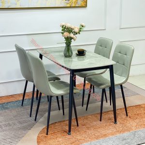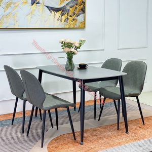 Chất liệu: Bàn mặt đá ceramic phủ bóng, ghế lót nệm bọc da PU, chân sắt sơn tĩnh điện.