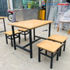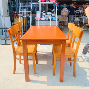 Bộ bàn ăn gỗ cũ gồm 1 bàn và 4 ghế, phù hợp sử dụng trong gia đình, quán ăn hoặc quán cà phê. Mặt bàn rộng rãi, ghế ngồi chắc chắn, thiết kế lưng tựa giúp thoải mái khi sử dụng. Chất liệu gỗ bền bỉ, chịu lực tốt, kết cấu vững chắc, ít cong vênh. Bề mặt sơn phủ giúp dễ dàng lau chùi, hạn chế bám bẩn.