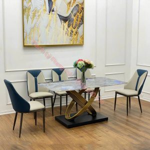 Chất liệu: mặt đá Ceramic, chân bàn mạ titan, ghế nệm bọc da