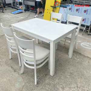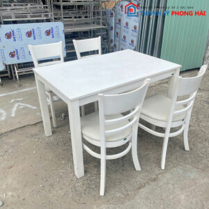 Mô tả: Bộ bàn ăn cabin cũ gồm 1 bàn chữ nhật và 4 ghế đồng bộ màu trắng, thiết kế đơn giản, phù hợp cho quán ăn, nhà hàng hoặc sử dụng trong gia đình. Mặt bàn phẳng rộng, dễ dàng lau chùi. Ghế có tựa lưng cong nhẹ giúp ngồi thoải mái hơn. Chân bàn và ghế chắc chắn, đảm bảo độ bền khi sử dụng lâu dài. Bộ bàn ghế này thích hợp với không gian sang trọng, tinh tế.