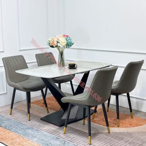 Chất liệu: mặt đá Ceramic, chân sắt sơn tĩnh điện, ghế nệm bọc da PU