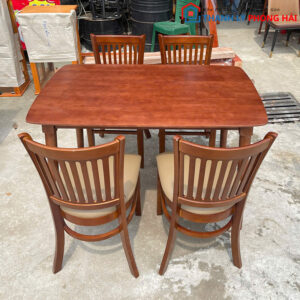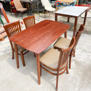 Mô tả: Bộ bàn ăn gỗ sang trọng với mặt bàn hình chữ nhật, kiểu dáng đơn giản nhưng không kém phần tinh tế. Sản phẩm này được thiết kế với 4 ghế có tựa lưng, tạo cảm giác thoải mái khi ngồi, phù hợp cho các gia đình nhỏ hoặc không gian ăn uống vừa phải.