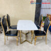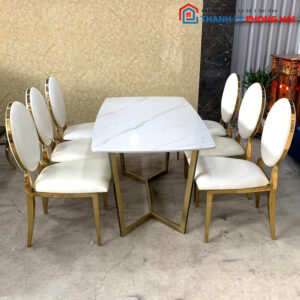 Chất liệu: Mặt bàn đá ceramic cao cấp, khung ghế và chân bàn kim loại mạ vàng, nệm ghế bọc da simili.