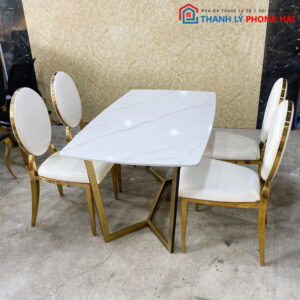 Chất liệu: Mặt bàn đá ceramic cao cấp, khung ghế và chân bàn kim loại mạ vàng, nệm ghế bọc da simili.