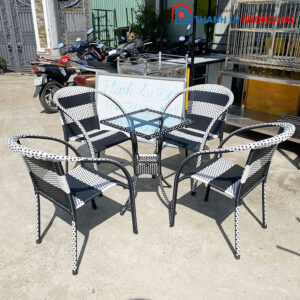 - Chất liệu: Bàn kính, ghế nhựa giả mây khung sắt chắc chắn.