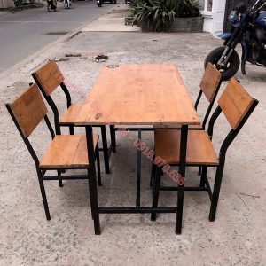 Mô tả: bộ bàn ghế gồm 4 ghế và 1 bàn (có bán lẻ) được làm từ gỗ công nghiệp, khung sắt được sơn tĩnh điện. Sản phẩm phù hợp sử dụng ở các quán cafe cóc và quán ăn.