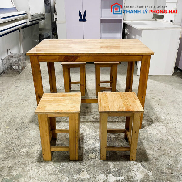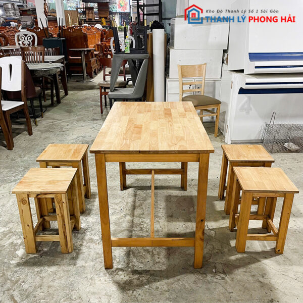Mô tả: Bộ bàn ghế quán ăn cũ gồm 1 bàn và 4 ghế không tựa, thích hợp cho các quán ăn, quán cà phê hoặc gia đình. Bàn có thiết kế đơn giản, mặt bàn rộng và phẳng, chân bàn vững chắc, phù hợp cho việc sử dụng hàng ngày. Ghế ngồi không tựa giúp dễ dàng di chuyển, phù hợp cho không gian ăn uống cần sự linh hoạt. Toàn bộ sản phẩm được làm từ gỗ tự nhiên chắc chắn, màu gỗ sáng, dễ dàng vệ sinh và bảo dưỡng. Bộ bàn ghế này mang lại sự thoải mái, tiện lợi, tiết kiệm chi phí và phù hợp cho các không gian ăn uống nhỏ gọn.