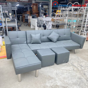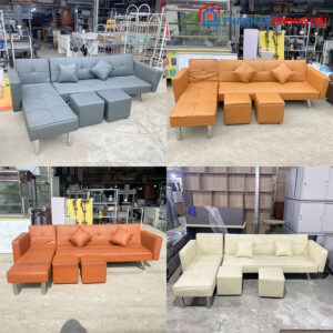 Bộ sofa bed góc L bọc da được thiết kế hiện đại, phù hợp với không gian gia đình hoặc văn phòng. Sản phẩm có cấu trúc chắc chắn, kiểu dáng góc L tiện lợi, dễ dàng thay đổi vị trí. Lớp da mềm mại, màu sắc trang nhã, kết hợp với nệm êm ái tạo cảm giác thoải mái khi sử dụng. Đi kèm là hai ghế đôn nhỏ, tối ưu hóa không gian và đáp ứng nhu cầu sử dụng linh hoạt.