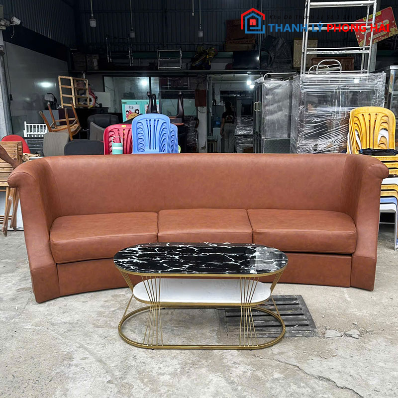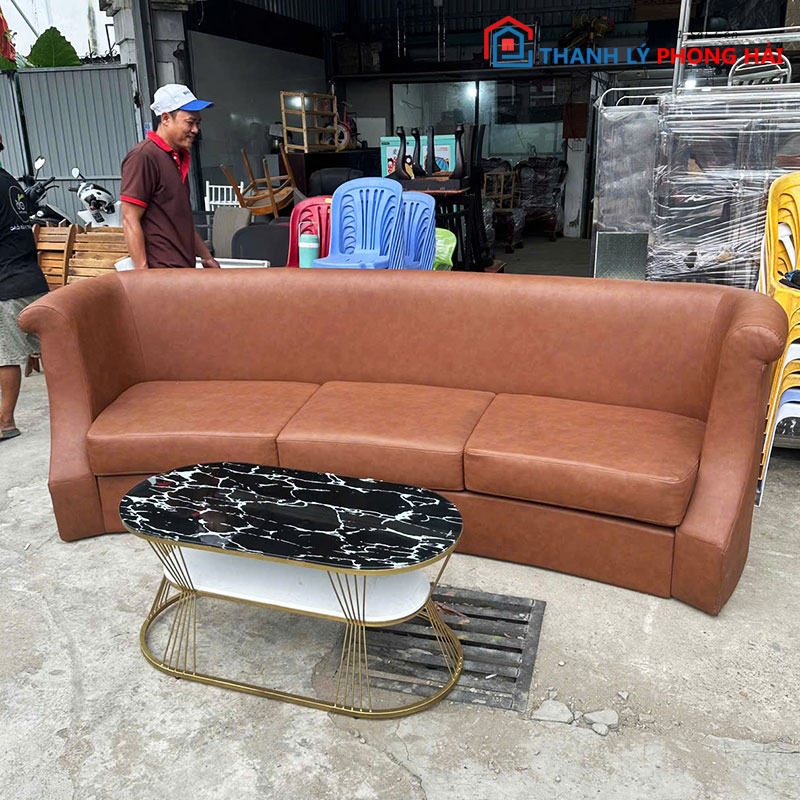 Kho Thanh Lý Phong Hải chuyên thanh lý sofa cũ, bàn trà và nội thất decor cao cấp giá cực tốt. Bộ sofa bọc da nâu kèm bàn oval hai tầng là lựa chọn hoàn hảo cho không gian sang trọng, hiện đại mà vẫn tiết kiệm chi phí. Hàng còn rất mới, da không rách, khung chắc chắn, bàn vân đá sáng bóng. Mời khách đến xem trực tiếp tại kho hoặc liên hệ Zalo để được báo giá nhanh và giữ hàng sớm nhất.