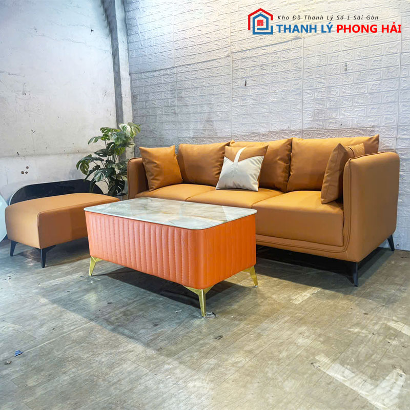 Bộ sofa màu cam hiện đại kèm bàn mặt đá đang có tại Thanh Lý Phong Hải, hỗ trợ giao hàng tận nơi tại TP.HCM và các tỉnh lân cận. Ngoài mẫu sofa này, kho còn nhiều loại sofa góc, sofa nỉ, sofa da cao cấp thanh lý và bàn trà sofa đa dạng kiểu dáng. Quý khách có thể tham khảo thêm để lựa chọn sản phẩm phù hợp nhất cho không gian phòng khách.