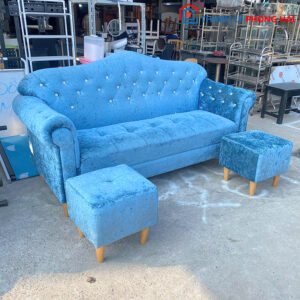 Mô tả: Bộ sofa bọc vải nhung cao cấp, thiết kế sang trọng với tựa lưng bo cong, đính nút trang trí tinh tế. Đệm ngồi dày dặn, êm ái, mang lại sự thoải mái tối đa. Chân ghế gỗ chắc chắn, phù hợp cho phòng khách, tiệm spa, salon hoặc studio chụp ảnh. Đi kèm 2 ghế đôn tiện lợi.