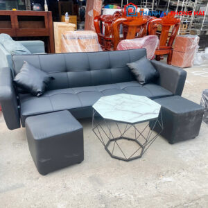 Mô tả: Bộ sofa bed đa năng gồm ghế sofa dài, hai đôn vuông và bàn trà mặt kính giả đá. Sofa được bọc da êm ái, phần đệm ngồi rộng rãi và thiết kế gọn gàng, có thể mở ra làm giường ngủ tiện dụng, thích hợp cho không gian phòng khách hiện đại hoặc khu vực chờ. Bàn trà mặt kính kết hợp chân sắt sơn tĩnh điện chắc chắn, tạo điểm nhấn sang trọng.