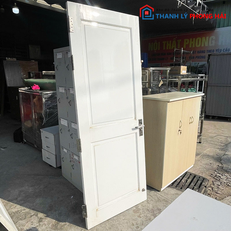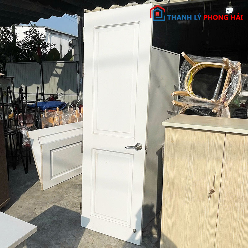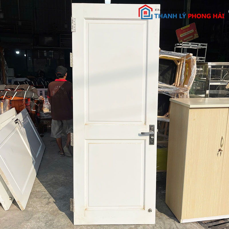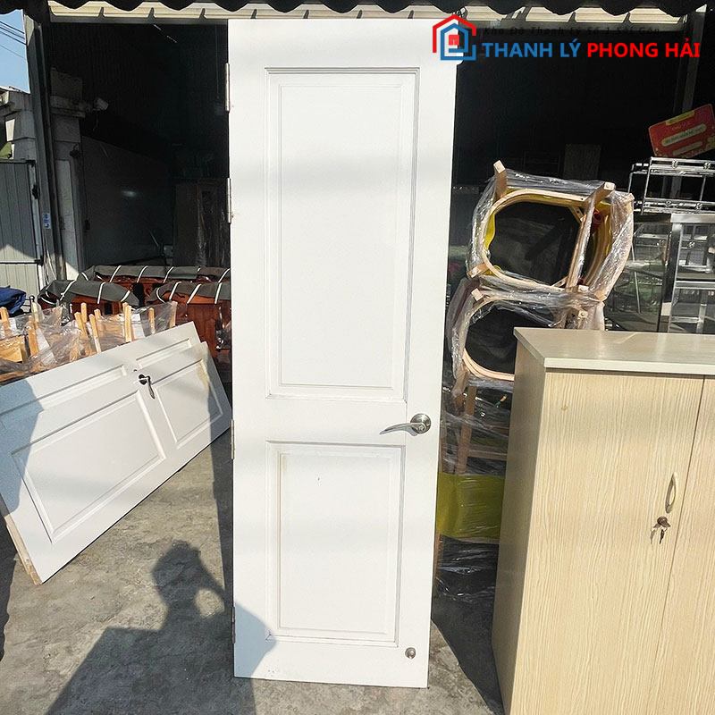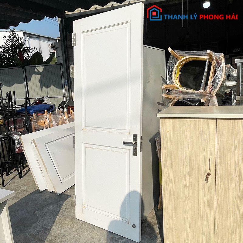 Mẫu cửa gỗ cũ sơn màu trắng, thiết kế đơn giản với các ô pano tạo điểm nhấn nhẹ, phù hợp lắp cho phòng ngủ, phòng làm việc, nhà trọ hoặc công trình cần cửa thay thế tiết kiệm chi phí. Cửa có form thẳng, bản cánh chắc chắn, bản lề và khóa còn sử dụng tốt, chỉ cần lắp vào là dùng ngay.