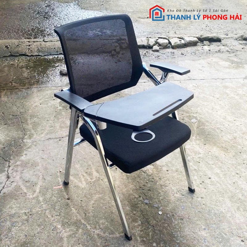 Ghế gấp liền bàn thiết kế gọn gàng, tiện dụng cho lớp học, phòng đào tạo, hội trường, phòng họp ngắn hạn hoặc học tập tại nhà. Mặt bàn liền ghế chắc chắn, có ngăn/khay để ly tiện lợi khi sử dụng lâu. Phần chân sắt chịu lực tốt, đứng vững; ghế có thể gấp gọn giúp tiết kiệm diện tích khi không dùng. Lưng ghế thoáng, ngồi thoải mái, dễ di chuyển và sắp xếp theo hàng. Hàng đã qua sử dụng nhưng còn tốt, dùng ổn định.