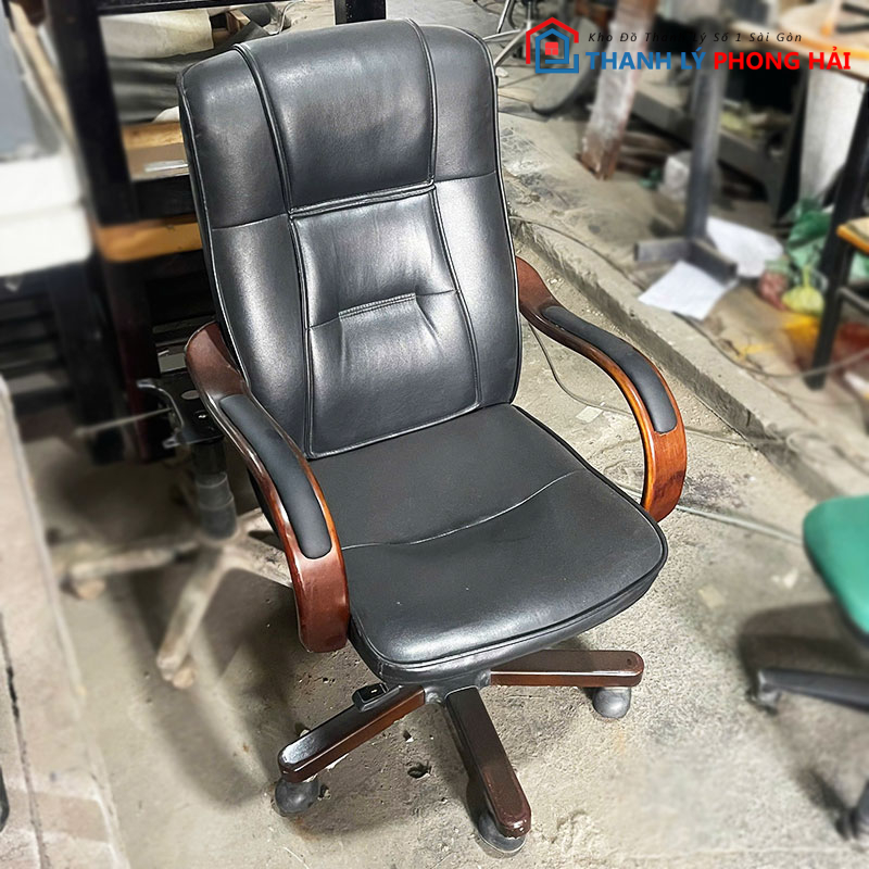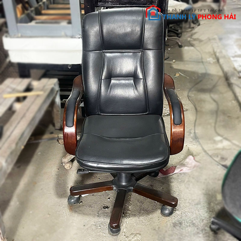 Ghế giám đốc bọc da màu đen, thiết kế sang trọng với tay và chân ghế bằng gỗ chắc chắn, mang đến cảm giác thoải mái và đẳng cấp cho không gian văn phòng. Đệm ngồi và tựa lưng mềm mại, giúp giảm áp lực khi ngồi lâu. Khung ghế vững chãi, có khả năng xoay 360 độ và điều chỉnh độ cao linh hoạt, phù hợp với nhiều nhu cầu công việc. Sản phẩm đã qua sử dụng nhưng còn chắc chắn, phù hợp cho văn phòng hoặc phòng làm việc cá nhân.