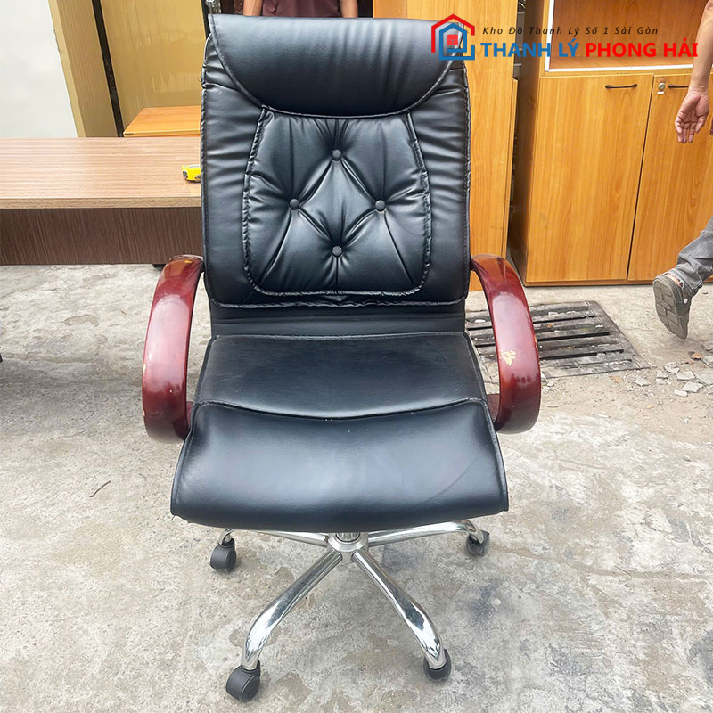 Ghế Giám Đốc Da Đen Chân Xoay Cũ – Thiết Kế Tay Phối Gỗ