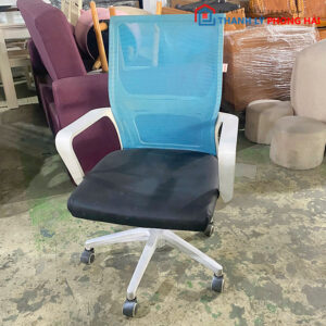 Mô tả: Ghế xoay lưng cao với phần tựa lưới thoáng khí màu xanh, giúp ngồi lâu không bị hầm lưng. Tay vịn nhựa chắc chắn, khung chân sao có bánh xe di chuyển linh hoạt. Đệm ngồi dày vừa phải, phù hợp làm việc, học tập hoặc sử dụng tại nhà.