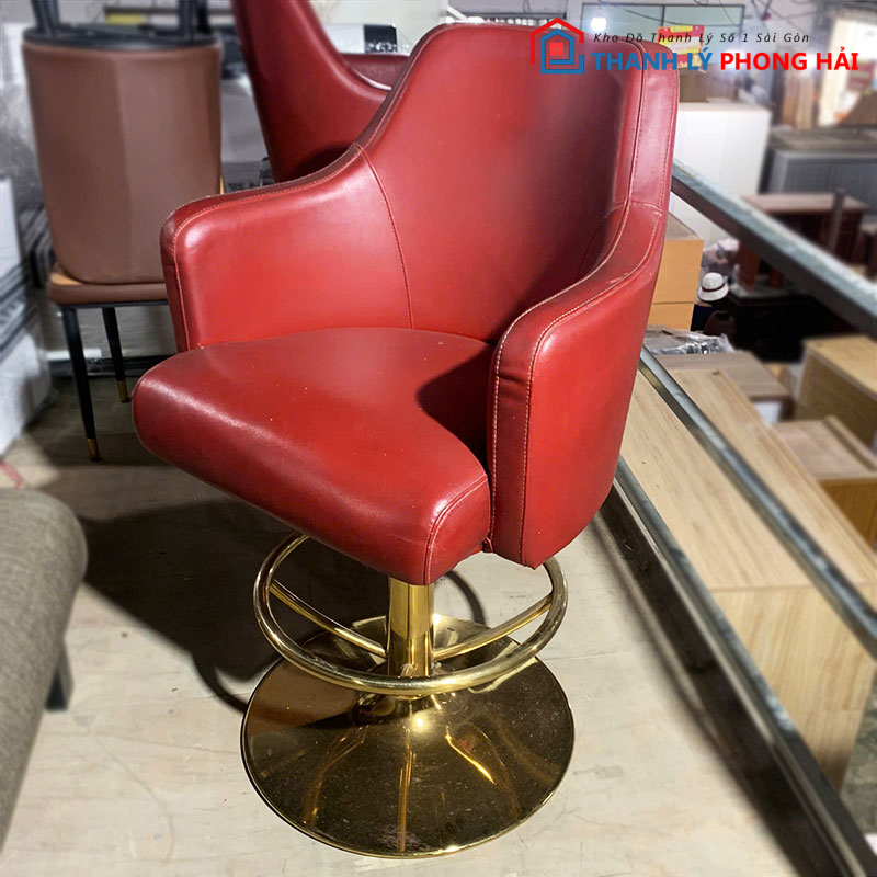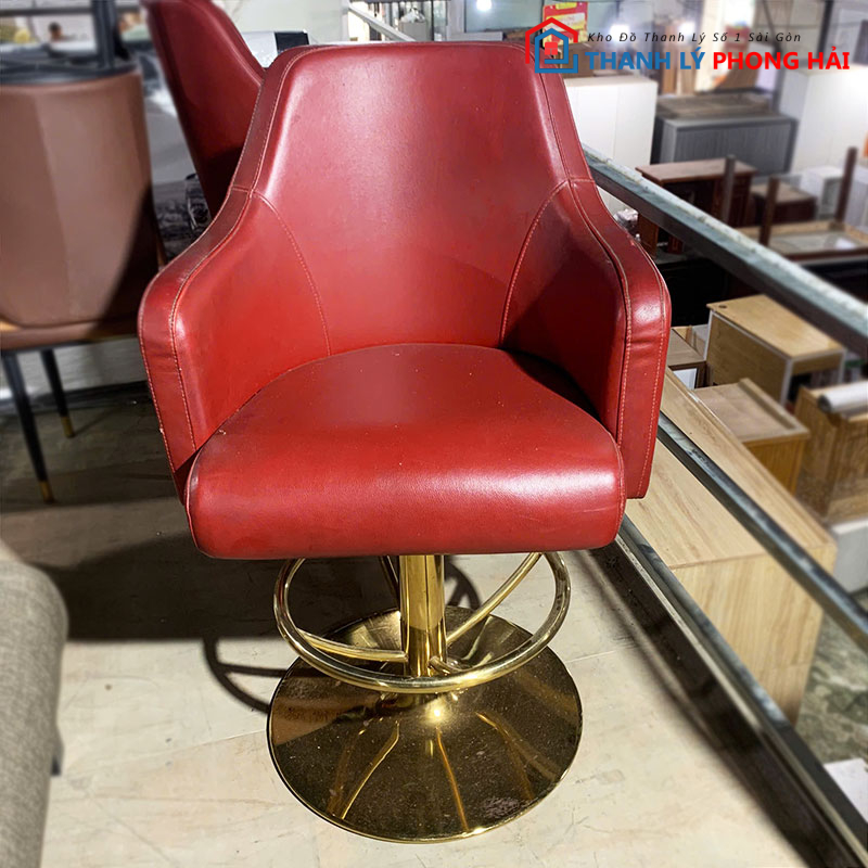 Ghế xoay bọc simili đỏ với chân sắt sơn vàng là sự lựa chọn hoàn hảo cho không gian làm việc sang trọng và tiện nghi. Ghé Thanh Lý Phong Hải để xem thêm các mẫu nội thất tiệm tóc, nail, spa cũ khác. Liên hệ Zalo hoặc đến kho trực tiếp để chọn sản phẩm phù hợp!