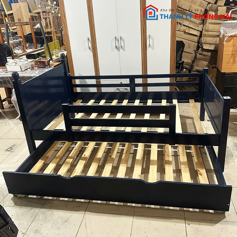 Giường 1m2 thiết kế thông minh với phần giường phụ có thể kéo ra ở phía dưới, rất tiện lợi cho phòng trọ, homestay hoặc gia đình có trẻ nhỏ. Khung giường làm từ gỗ chắc chắn, sơn màu đen sang trọng, dễ phối với mọi không gian. Các thanh giường bằng gỗ tự nhiên, chịu lực tốt, thoáng khí. Khi không sử dụng, phần giường phụ có thể đẩy gọn vào bên dưới giúp tiết kiệm diện tích tối đa.