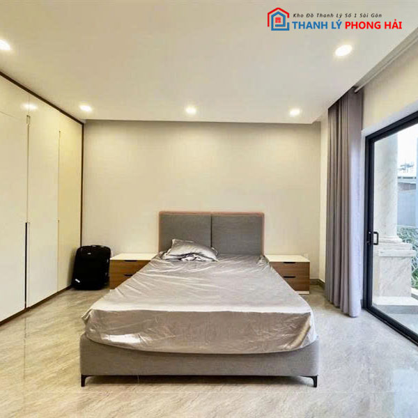 • Chất Liệu Giường: Vải bọc nệm xám, khung chắc chắn