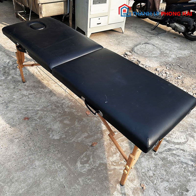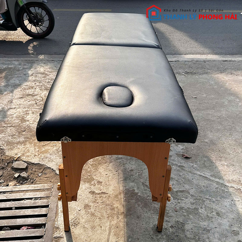 Phần mặt giường được bọc da màu sẫm, bề mặt êm, dễ lau chùi và vệ sinh sau mỗi lần sử dụng. Đệm có độ dày vừa phải, nằm thoải mái trong quá trình massage hoặc trị liệu. Khung chân làm bằng gỗ chắc chắn, chịu lực tốt, sử dụng ổn định, không rung lắc khi thao tác.