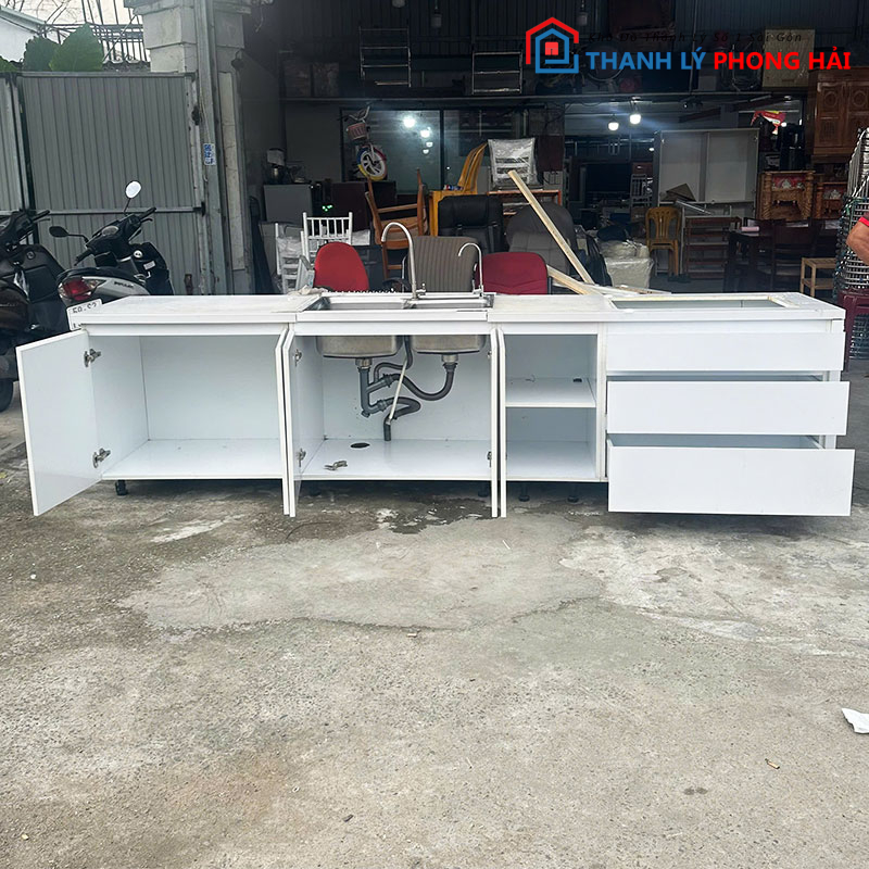 Hệ tủ bếp cũ gỗ công nghiệp MDF phủ Melamine màu trắng tinh tế, thiết kế hiện đại gồm tủ bếp trên và tủ bếp dưới. Bếp dưới bố trí nhiều ngăn kéo và hộc tủ để xoong nồi, bếp gas, có sẵn bồn rửa inox đôi tiện lợi. Phần tủ treo phía trên chia nhiều ngăn để chén đĩa và vật dụng bếp. Tổng thể tủ bền chắc, dễ lau chùi, thích hợp cho gia đình, quán ăn hoặc căn hộ nhỏ. Hàng cũ còn mới, cửa tủ đóng mở nhẹ, bề mặt sáng đẹp, giá thanh lý cực tốt.