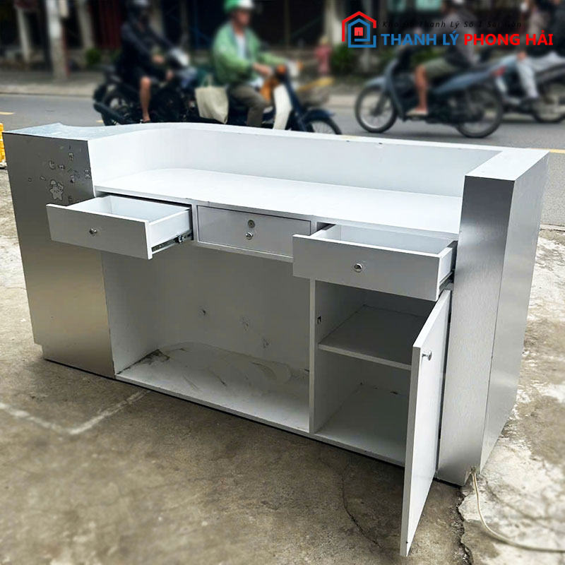 Kho Thanh Lý Phong Hải chuyên cung cấp quầy lễ tân cũ, quầy thu ngân, bàn làm việc, nội thất văn phòng và cửa hàng với giá siêu rẻ. Sản phẩm được chọn lọc kỹ, đảm bảo chắc chắn, thẩm mỹ cao và phù hợp nhiều phong cách setup. Quầy lễ tân 1m8 màu bạc hiện đang có sẵn tại kho, hàng còn rất mới, giá tốt cho khách mua nhanh. Mời quý khách đến trực tiếp xem sản phẩm hoặc liên hệ Zalo để được tư vấn và giữ hàng.