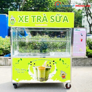 Mô tả: Quầy trà sữa nhà làm màu xanh lá, khung kim loại chắc chắn với thiết kế hai tầng kệ kính. Bên dưới là không gian lưu trữ rộng rãi. Logo và thông tin sản phẩm được in rõ ràng trên mặt trước, có bánh xe giúp di chuyển linh hoạt, tiện lợi cho các hoạt động kinh doanh nhỏ lẻ hoặc quầy lưu động.