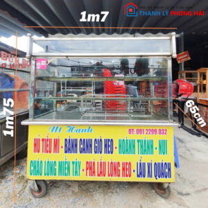 Mô tả: Quầy xe bán thức ăn cũ với thiết kế chắc chắn và tiện lợi, kích thước lớn. Xe được trang bị kính trong suốt giúp trưng bày món ăn một cách thu hút, kèm theo nhiều ngăn chứa đồ và kệ inox để sắp xếp nguyên liệu và dụng cụ một cách gọn gàng. Kích thước rộng rãi, phù hợp cho việc bán hủ tiếu, bánh canh, cháo lòng và các món ăn khác.