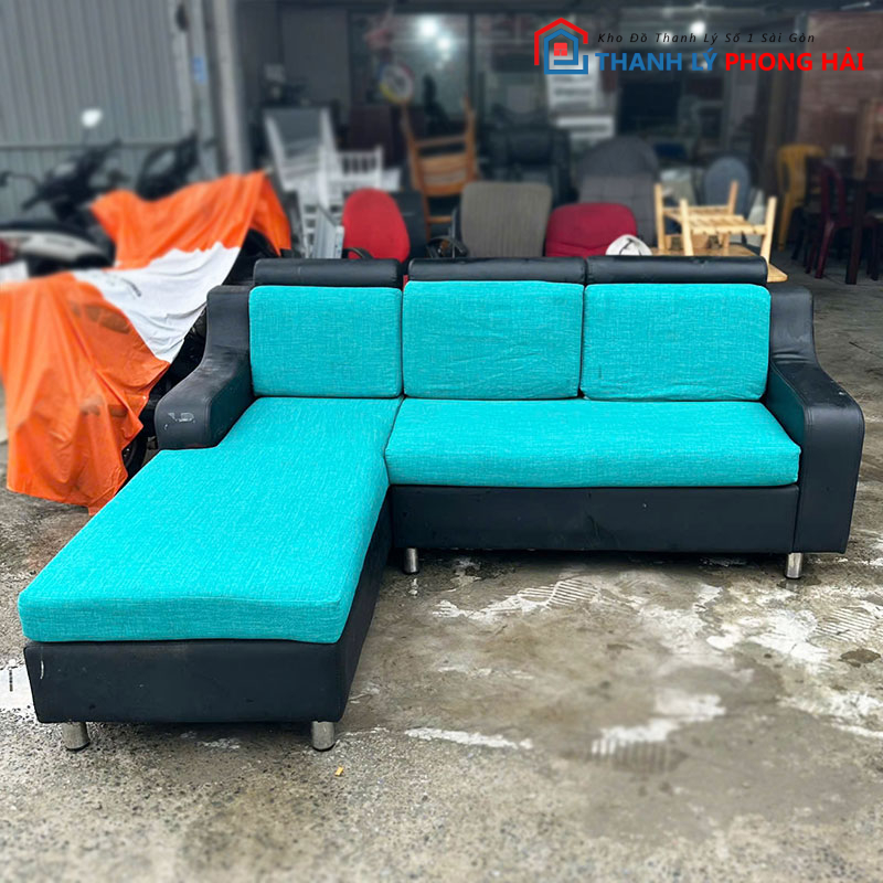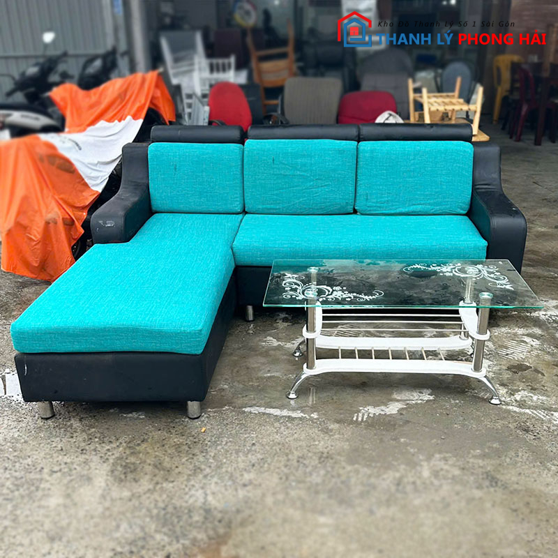 Sofa Góc L 2m Cũ Nệm Vải Màu Xanh – Kèm Bàn Kính Sang Trọng