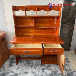 Mô tả: Mẫu học việc với kiểu dáng cổ điển, được tích hợp thêm 2 ngăn kéo và 1 tủ cực kỳ tiện lợi trong việc lưu trữ giấy tờ sách, vở và đồ đạc. Được làm hoàn toàn bằng chất liệu gỗ cao su cao cấp nên bàn cực kỳ cứng cáp và chắc chắn, dễ dàng vệ sinh khi bám bụi bẩn. Màu sắc trầm ấm phù hợp với nhiều không gian nội thất.