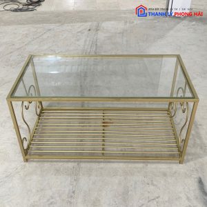 Mô tả: Mẫu bàn chữ nhật mặt kính sang trọng, khung bàn cứng cáp được trang trí hoa văn bắt mắt, mặt dưới gắn các thanh song sắt dùng để chứa đồ đạc, sách báo. Sản phẩm tương thích với hầu hết các dòng sofa cổ điển đến hiện đại.