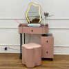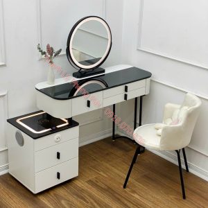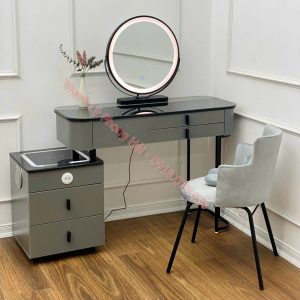 Mô tả: Bộ bàn trang điểm gồm 1 bàn với mặt kính cao cấp, gương tròn gắn đèn led, ghế chân sắt bọc nệm êm ái. Với các tính năng thông minh đi kèm như: Cổng USB sạc điện thoại, loa bluetooth, đèn led với 3 chức năng và sạc không dây dành cho iphone.
