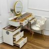 Chất liệu: Bàn gỗ công nghiệp với mặt kính, gương gắn đèn led, ghế bọc simili.